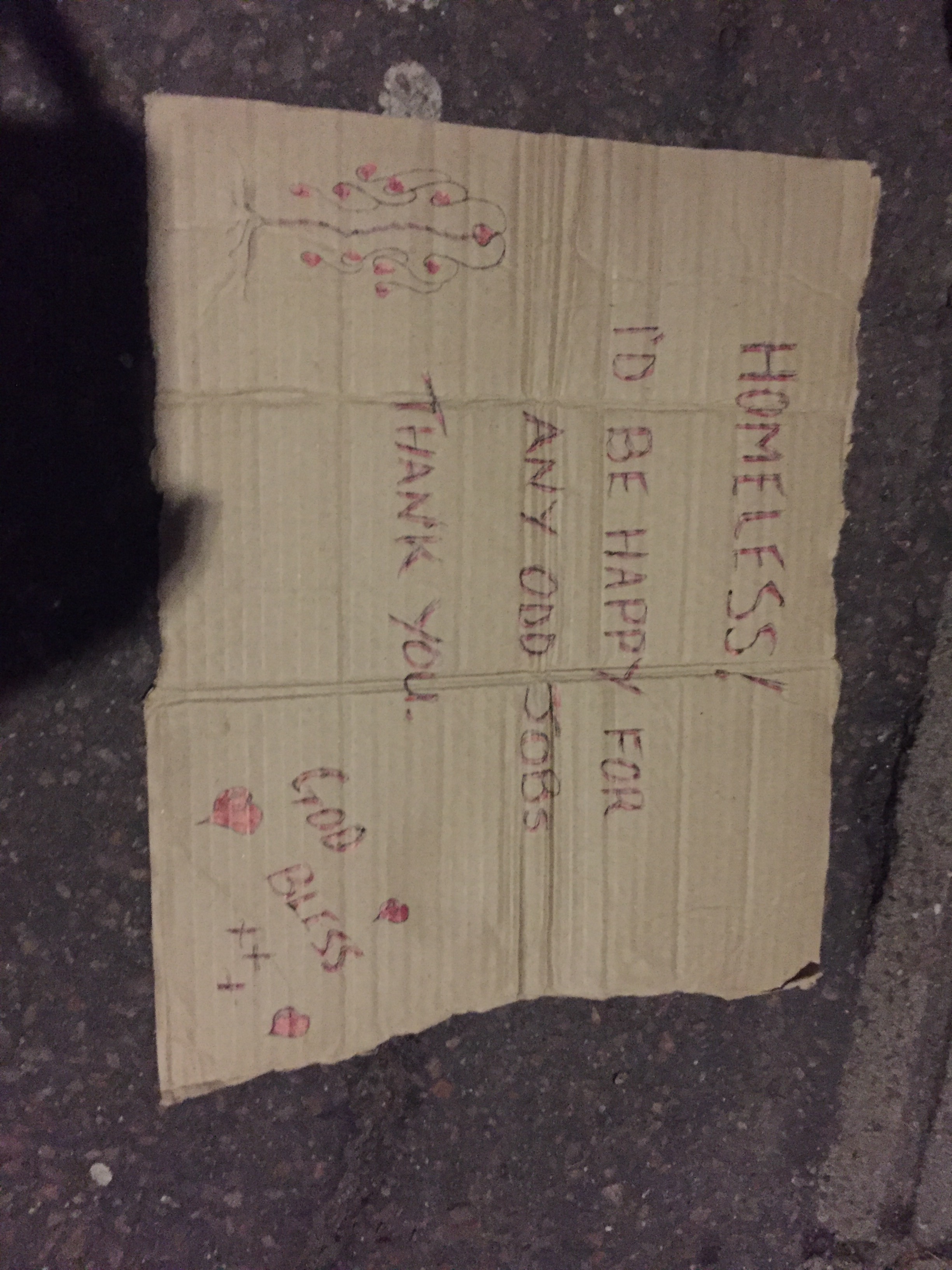 I’m driving back home and through Westbourne high street. I’m skint, and only recently my dad was helping me out with budgeting. We agreed I spend too much money on homeless people!